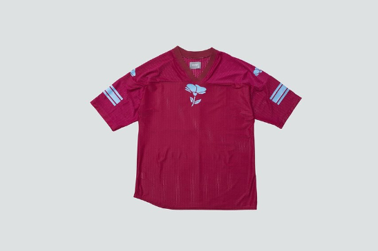 Playera tipo jersey con vibra urbana. Diseño de manga corta inspirado en el corte clásico del fútbol americano, confeccionado en tela ligera y perforada para ese toque retro deportivo. Destaca por sus estampados en rosa y kanjis que se imponen al frente, espalda y mangas—una mezcla perfecta entre streetwear y actitud.